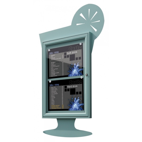 Tyto designové moderní vitríny zkrášlí zdi restauračních podniků a přitom zviditelní jídelní karty, menu, otevírací hodiny. Vitrína typu Tradition, hl. 30 mm. Bezpečnostní zámek se 2 klíči. Obrazec z lakovaného žárově zinkovaného plechu tl. 2 mm. Připevnění ke zdi. Magnetky VITINCOM® zdarma (1 na A4). 5 obrazců: Kávový hrníček (2xA4), Půllitr na pivo (4xA4), Sklenička na koktejly (4xA4), Kruhové menu (6xA4), Čtvercové menu (6xA4). Osvětlená vitrína : obraťte se na nás.